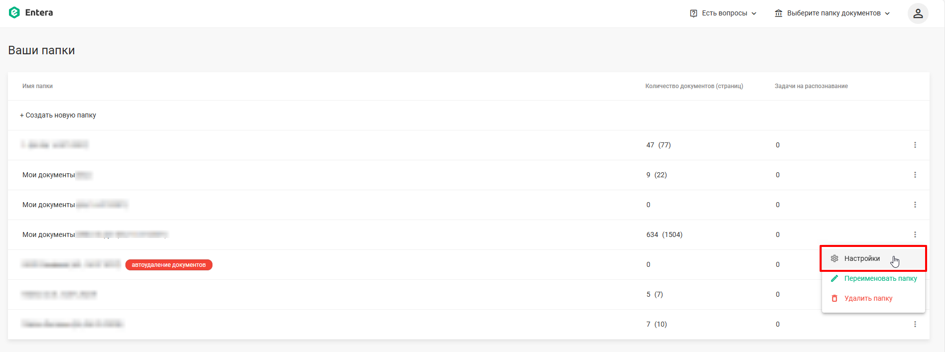 Далее бот уточнит папку назначения в Entera. Так же папку по умолчанию можно выбрать в меню по команде: "Папка по умолчанию".