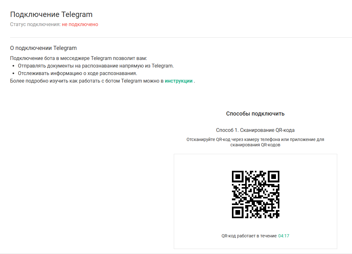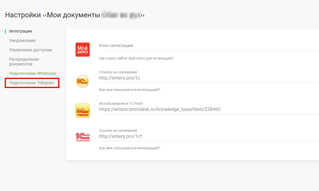 Для подключения бота перейдите на портал Entera. - Настройки - Подключение Telegram