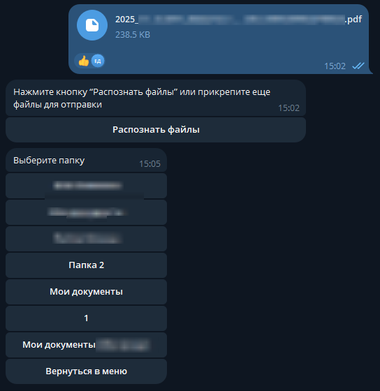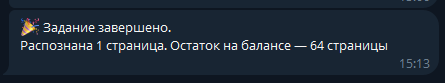 Бот оповестит об успешном распознавании и напомнит сколько страниц в данной папке осталось. При необходимости уведомление можно отключить в Меню.