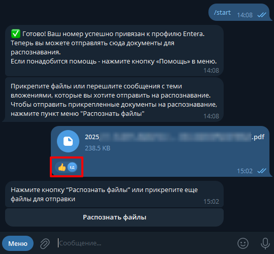 По скрепке отправляем необходимые для распознавания файлы. После быстрой проверки на файле появится отметка о корректности вложения.