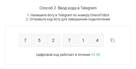 К одному логину Entera можно привязать только один номер телефона в Telegram.