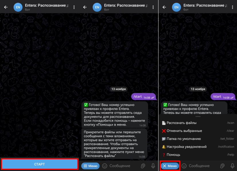 После успешной привязки аккаунта Telegram будет доступно Меню.