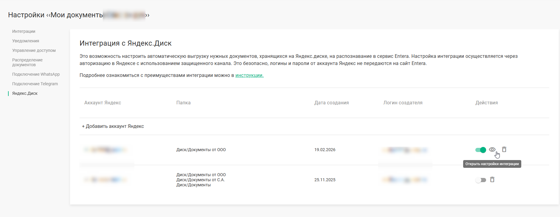 - Для подключения Яндекс диска перейдите на портал Entera. - Настройки - Яндекс.Диск - Добавить аккаунт Яндекс