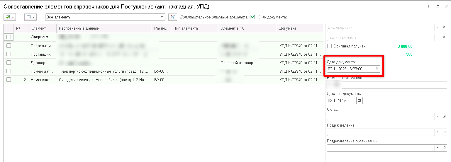 На этапе сопоставления в поле "Дата документа" меняем время на нужное.